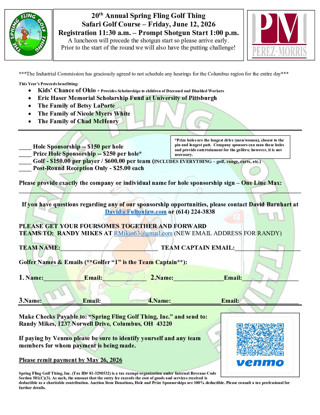 This year’s 20th Annual Spring Fling Golf Outing will take place at Safari Golf Club in Powell, OH. Proceeds will benefit Kids Chance of Ohio Inc., the Eric Z. Haser Memorial Scholarship at the University of Pittsburgh, and the families of Betsy LaPorte and Nicole Myers White. To date, the event has raised over $300,000!